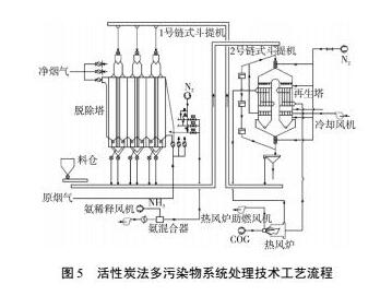 為了降低燃?xì)獾氖褂昧浚梢圆扇煔庋h(huán)燒結(jié)(如圖4所示),可減少約25%的煙氣排放量,相應(yīng)降低加熱煙氣所需的燃?xì)饬浚瑫r(shí)降低脫硫及脫硝的投資建設(shè)成本2.2活性炭法多污染物協(xié)同處理技術(shù)活性炭吸附法技術(shù)工藝簡單,占地面積小,是一種可同時(shí)去除粉塵、Nox、SO2等多污染物的煙氣凈化技術(shù),且該技術(shù)資源化利用率高,副產(chǎn)物為高濃度SO2氣體,可用于制備濃硫酸或其它高附加值的單質(zhì)硫等,具有良好的發(fā)展前景。 活性炭多污染物協(xié)同處理技術(shù)由吸附系統(tǒng)、解析系統(tǒng)、輸送系統(tǒng)和硫資源化利用系統(tǒng)組成。煙氣由增壓風(fēng)機(jī)引入吸附塔,氨氣在吸附塔入口加入,SO2、Nox、粉塵、二噁英、重金屬等污染物脫除在吸附塔內(nèi)完成。吸收了污染物的的活性炭通過輸送系統(tǒng)送往解析塔,在430℃氮?dú)鈿夥障聦钚蕴窟M(jìn)行加熱解析,產(chǎn)生富含SO2氣體,同時(shí)可以分解約70%的二噁英,活性炭經(jīng)篩分后重新利用,篩下物可送往高爐或燒結(jié)作為燃料使用,工藝流程如圖5所示。