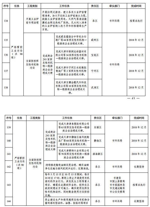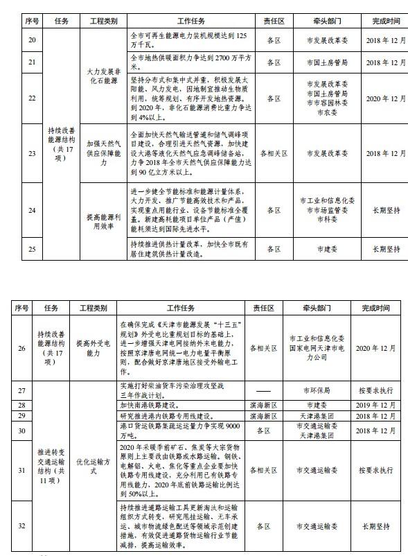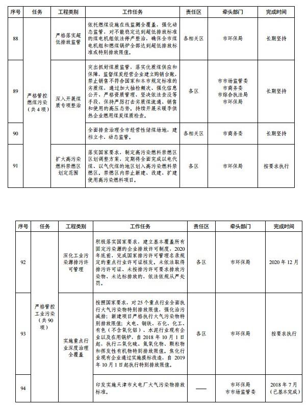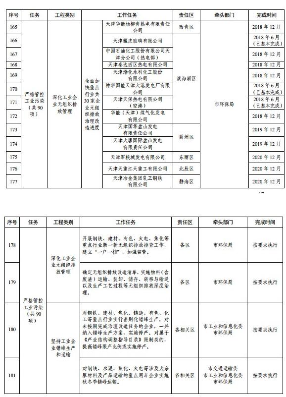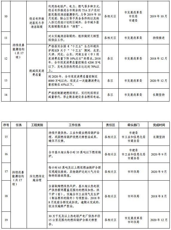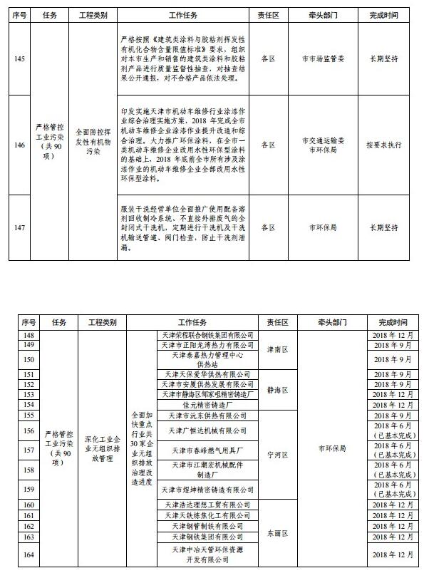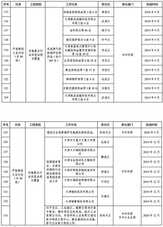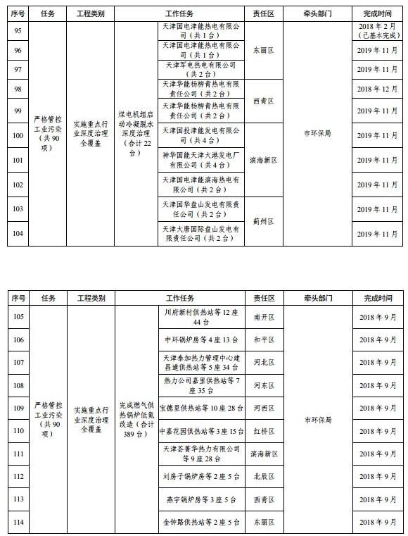 2018年,印發(fā)實(shí)施天津市火電廠大氣污染物排放標(biāo)準(zhǔn);2019年底前,完成全市22套公共煤電機(jī)組冷凝脫水深度治理。完成全市389臺(tái)燃?xì)忮仩t低氮改造,2018年9月底前完成222臺(tái),2019年9月底前完成167臺(tái);到2020年10月,全市燃?xì)忮仩t基本完成低氮改造。