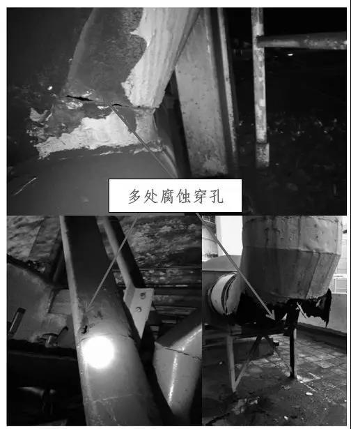 某沿海火力發(fā)電廠輸煤系統(tǒng)的干式靜電除塵器使用的是福建衛(wèi)東環(huán)保科技股份有限公司生產(chǎn)的MZZ4-2型高壓干式靜電除塵器,2007年投用,采用的是四電場立式結(jié)構(gòu),電場采用L型SPCC板和管狀針刺線,同極間距110mm,風(fēng)量24000m3,出口含塵量90mg/m3。隨著該廠大量使用印尼煤(每年占60%),設(shè)備腐蝕情況尤為嚴(yán)重,兩臺除塵器的除塵效率、除塵效果和防火防爆要求已不能滿足當(dāng)前運行工況。目前干式靜電除塵器主要存在殼體、風(fēng)管多處腐蝕穿孔(風(fēng)管腐蝕見圖1),電場腐蝕變形、脫落等問題。
