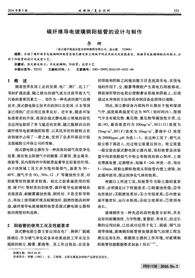【關鍵詞】濕式靜電除塵 導電玻璃鋼 陽極管 成型工藝